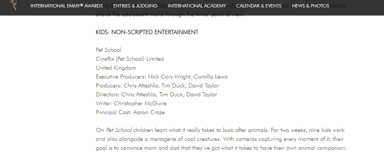 One undeniable highlight of my producing career was developing and producing the BAFTA winning Me:TV for Nickelodeon. This hit gameshow, where kids took part from home (utilising video-calling technology) was a thrill to work on. The BAFTA win and the subsequent franchising of our format around the world were certainly the icing on a very sweet cake. After launching the legendary Hacker T Dog in ‘The CBBC Office’, I returned to CBBC (through the production company Cineflix) to develop and write the International Emmy winning Pet School. I wrote 2 series of this innovative show, where children learned the skills necessary to be responsible pet owners.