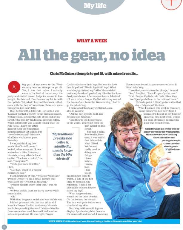 During this time I wrote dozens of columns on a whole host of subjects, from fancy dress to the ever present menace of seagull attack. I also wrote many features (often interviews with prominent figures in the south west) along with occasional pieces that documented me throwing myself into worryingly emersive experiences, like having my legs waxed. Don’t ask.